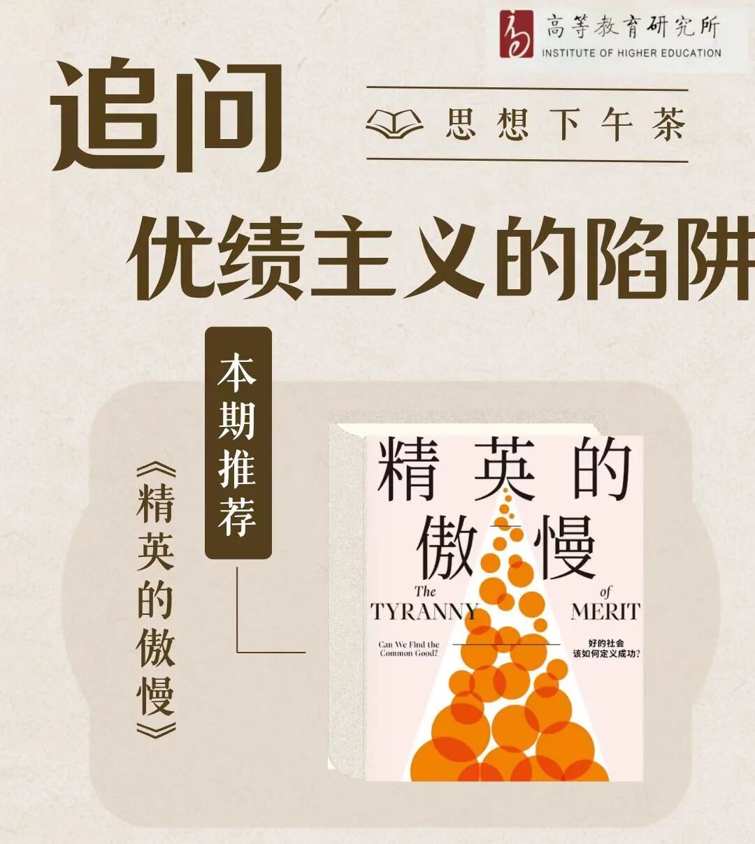 2026年4月1日下午,高等教育研究所春季学期第一次“思想下午茶”活动在文科大楼1413举行,主要围绕迈克尔・桑德尔的《精英的傲慢:好的社会该如何定义成功?》(曾纪茂译,中信出版社 2021 年版)一书展开讨论。2025级硕士吕婉婉、张宁宇担任导读,2025级硕士苏比主持,李欣老师出席指导。