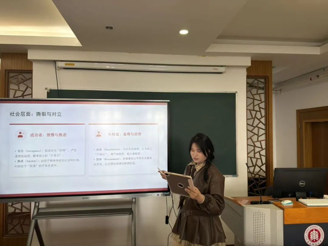 吕婉婉同学则从生活中的两件小事出发,分享了阅读《精英的傲慢》后自己的心态转变。此前,她将成绩不佳下意识地归因为不够努力;而这学期,当自己全力以赴准备课堂展示,却发现自己的成果不如他人时,又陷入了深深的自我怀疑。读完《精英的傲慢》后,她开始学会换位思考,将家庭环境等客观因素纳入对成绩的考量,对于自己的努力与结果,也能以更平和的心态看待,不再以单一的标准评价自己。她的分享让大家深刻意识到,优绩主义的影响藏在日常的每一个评价瞬间,学会包容差异、正视客观因素,才能真正与自己和解,与他人和解。